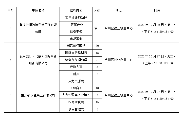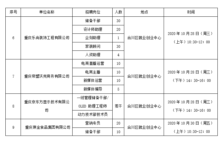 2020年10月26日至10月30日专场招聘会安排表